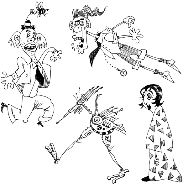 Mostly they are disconnected figures, as if from some not-yet-designed comic book no one would read.